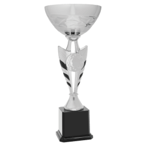 Sleek, stylish, and built to impress — the Winged Easy Cup Trophy is a timeless symbol of excellence and achievement. This striking design features a gleaming silver cup bowl atop a sculpted column accented with dynamic black detailing and a central medallion area, ideal for sport or activity-specific inserts.